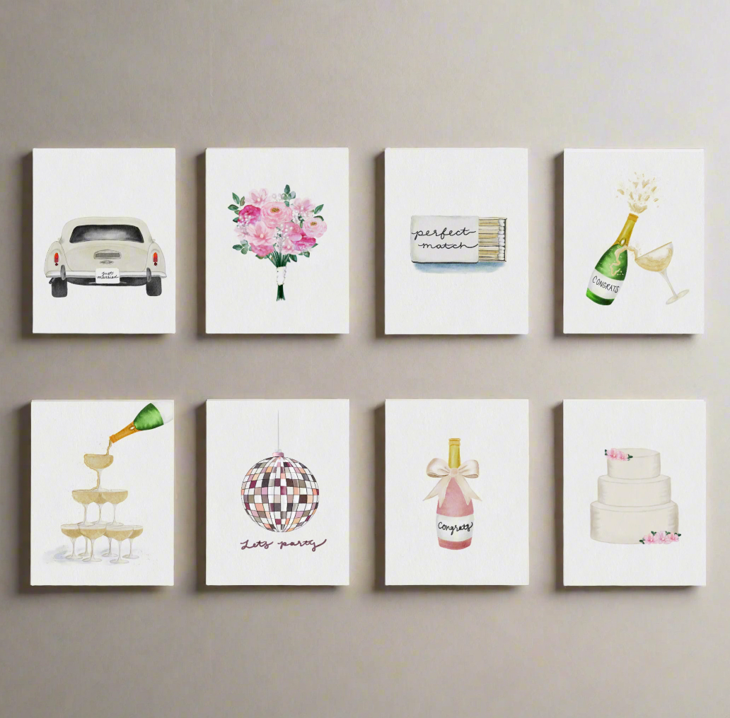 Introducing Collection Two, here to help you celebrate all wedding related celebrations in a stunning selection of watercolor printed cards. Featuring exquisite designs filled champagne towers, a disco ball, a perfect match box, and more. Elevate your gifting game with this exclusive collection.